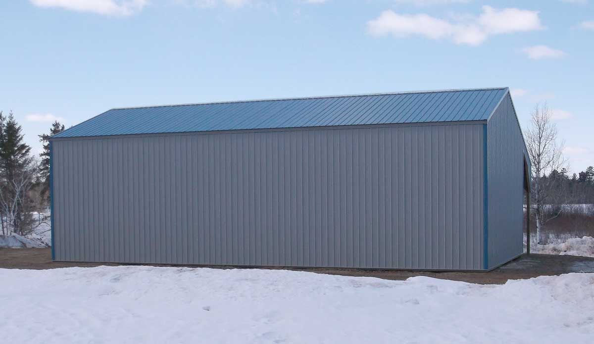 This shed is a 30x56x16 pole shed with 10x56 lean to, 2-12x14 garage doors and 1-3 foot service door. The colors are Hawaiian blue roof and trim with ash grey walls.